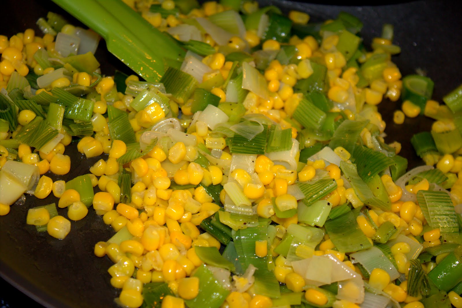 Heat butter and olive oil in large sauté pan over medium heat. Add leeks; season with salt and pepper; sauté covered for 10 minutes. Add corn; sauté for another 3 minutes. Set aside.